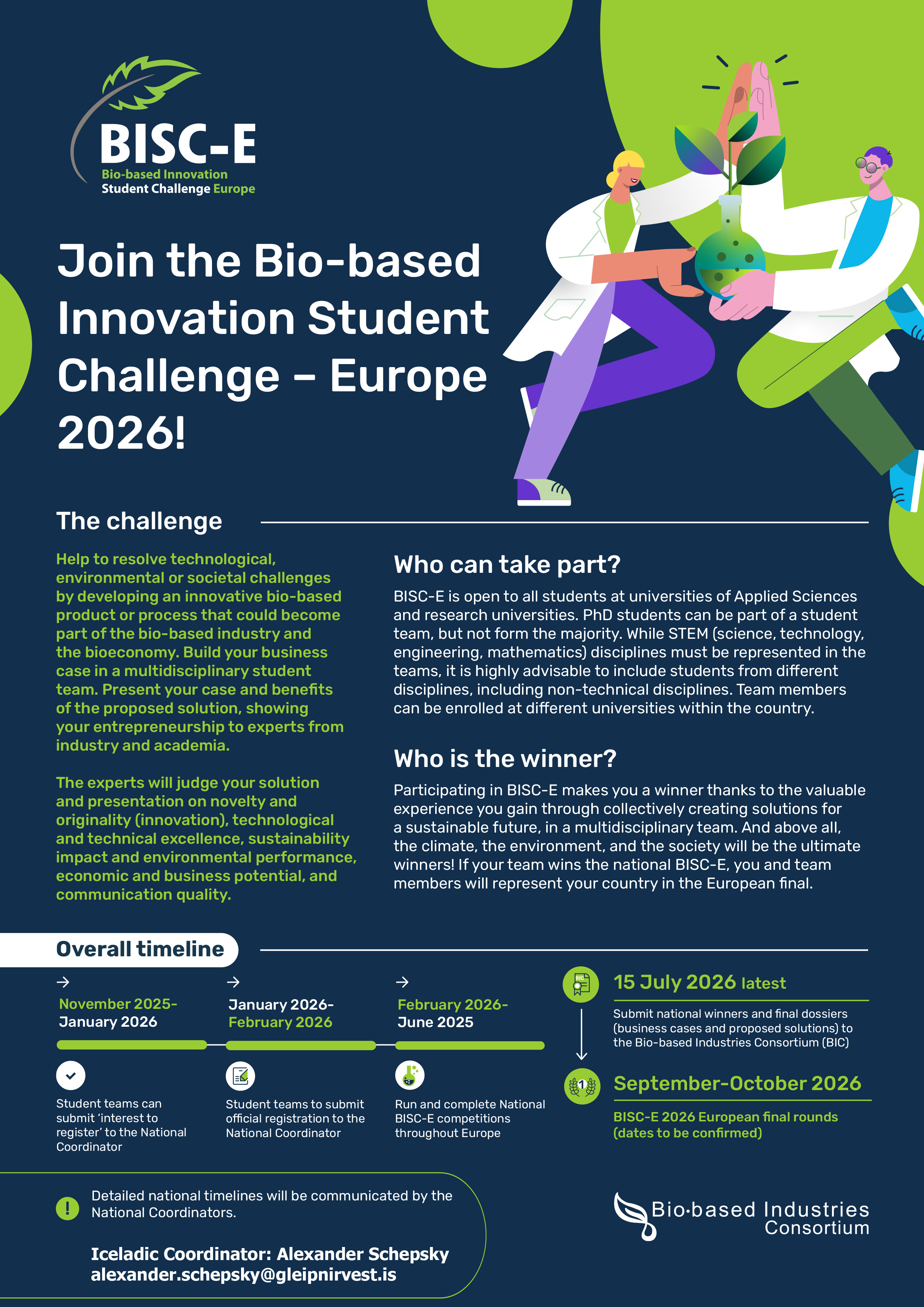 Evrópska nýsköpunarkeppnin á sviði lífvísinda, BISC-E hefur opnað fyrir umsóknir. Keppninni er ætlað að styðja við frumkvöðlastarf og verðlauna framúrskarandi verkefni. Áhersla er á að veita nemendum tækifæri til að efla nýsköpun til að takast á við áskoranir á sviði tækni, umhverfis eða samfélagsins með lífvísindalegri nálgun og þjálfa í frumkvöðlastarfi.